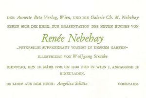 Renée Nebehay, gebürtige Engländerin, arbeitete in den Kriegsjahren beim Verlag Faber & Faber in London, 1952-56 lebte sie in Florenz. 1956 kam sie nach Wien, um bei der IAEA zu arbeiten. 1962 Heirat mit dem Kunsthändler und Autor Prof. Christian M. Nebehay. Renee Nebehay lebt in Wien. |